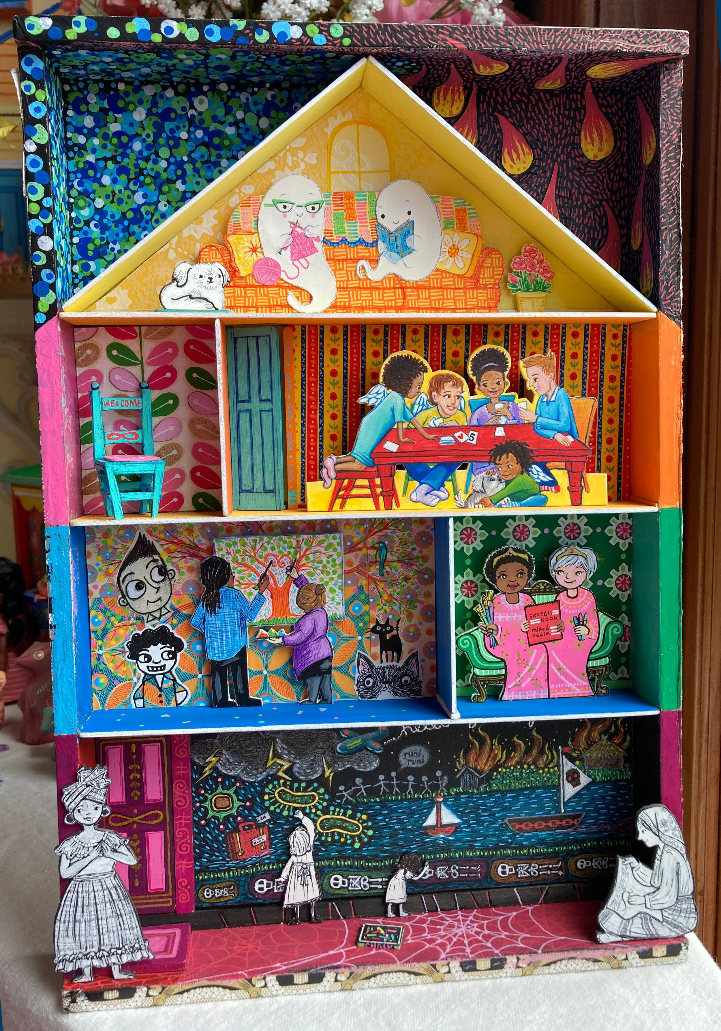 As a small child I was given a Colorforms dollhouse, and although I couldn't tell you what it looked like, I clearly remember that I found it absolutely thrilling. There was something about the spatial trick of a flat surface looking like a three dimensional space that gave me the excited feeling of discovering the answer to a mystery. That is definitely the feeling I was chasing working on this piece! The piece is also a celebration of the feeling that our loved ones (both living and in spirit) and our ancestors are present in our home. It feels happy and it feels good, despite all the repairs the house itself needs.